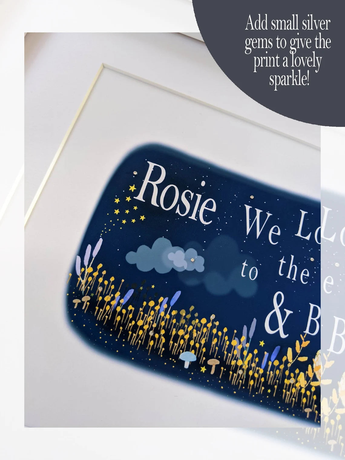 For an extra special addition - our art prints come with the perfect amount of sparkle, thanks to the small silver gems we add around the design. These gems add a beautiful shimmer in the light and as they are also very flat they won't get in the way when you frame the print. Please select ‘with gems’ when purchasing the item if you would like the print to be hand finished with gems.